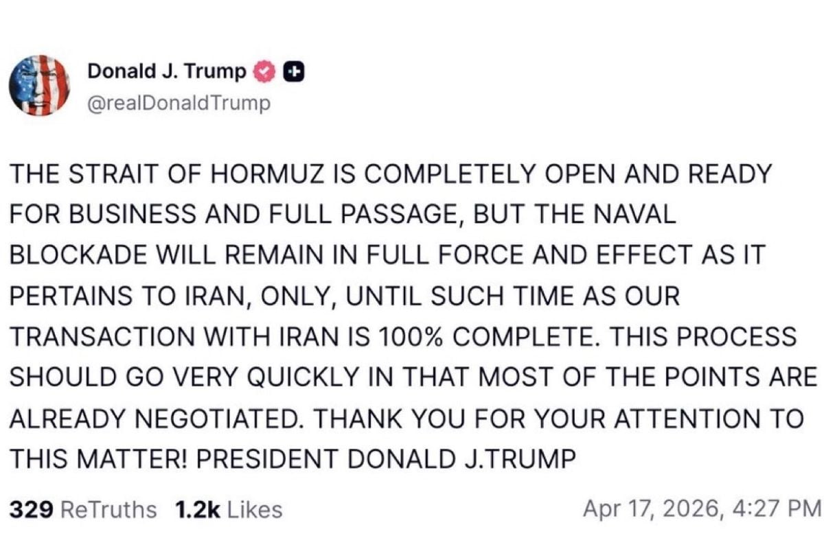 Trump’s Truth Social account posted two messages Friday. In one, he described the negotiation as a “TRANSACTION WITH IRAN” that would proceed until “100% COMPLETE,” with the U.S. naval blockade remaining in force until then, adding that the process “SHOULD GO VERY QUICKLY.” In another, he said the United States would get all the nuclear “dust” created by its B-2 bombers and added that “no money will exchange hands in any way, shape, or form.”